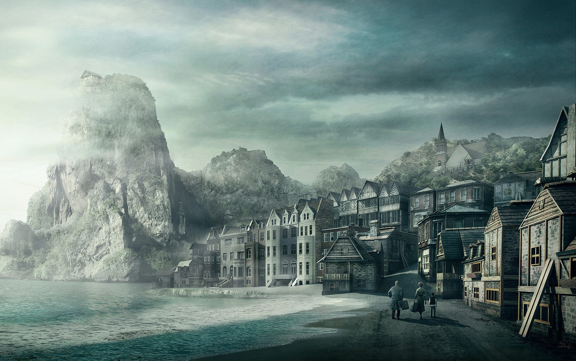 “It was a town of wide extent and dense construction, yet one with a portentous dearth of visible life. From the tangle of chimney-pots scarcely a wisp of smoke came […] The vast huddle of sagging gambrel roofs and peaked gables conveyed with offensive clearness the idea of wormy decay […]. There were some large square Georgian houses, too, with hipped roofs, cupolas, and railed “widow’s walks”. […] The decay was worst close to the waterfront, though in its very midst I could spy the white belfry of a fairly well-preserved brick structure which looked like a small factory. […] A sandy tongue had formed inside this barrier, and upon it I saw a few decrepit cabins, moored dories, and scattered lobster-pots.” - The Shadow over Innsmouth by H.P. Lovecraft