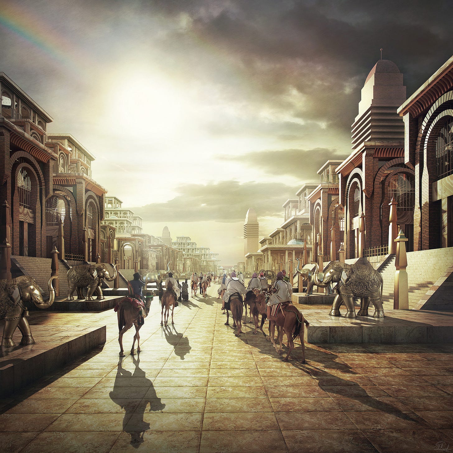 “The wonder of the world and the pride of all mankind was Sarnath the magnificent. Of polished desert-quarried marble were its walls. […] In Sarnath were fifty streets from the lake to the gates of the caravans, and fifty more intersecting them. With onyx were they paved, save those whereon the horses and camels and elephants trod, which were paved with granite. […] The houses of Sarnath were of glazed brick and chalcedony, each having its walled garden and crystal lakelet. But more marvellous still were the palaces and the temples, and the gardens made by Zokkar the olden king. […] Many were the pillars of the palaces, all of tinted marble, and carven into designs of surpassing beauty. Lofty and amazing were the seventeen tower-like temples of Sarnath, fashioned of a bright multi-coloured stone not known elsewhere” - The Doom That Came to Sarnath, HPL