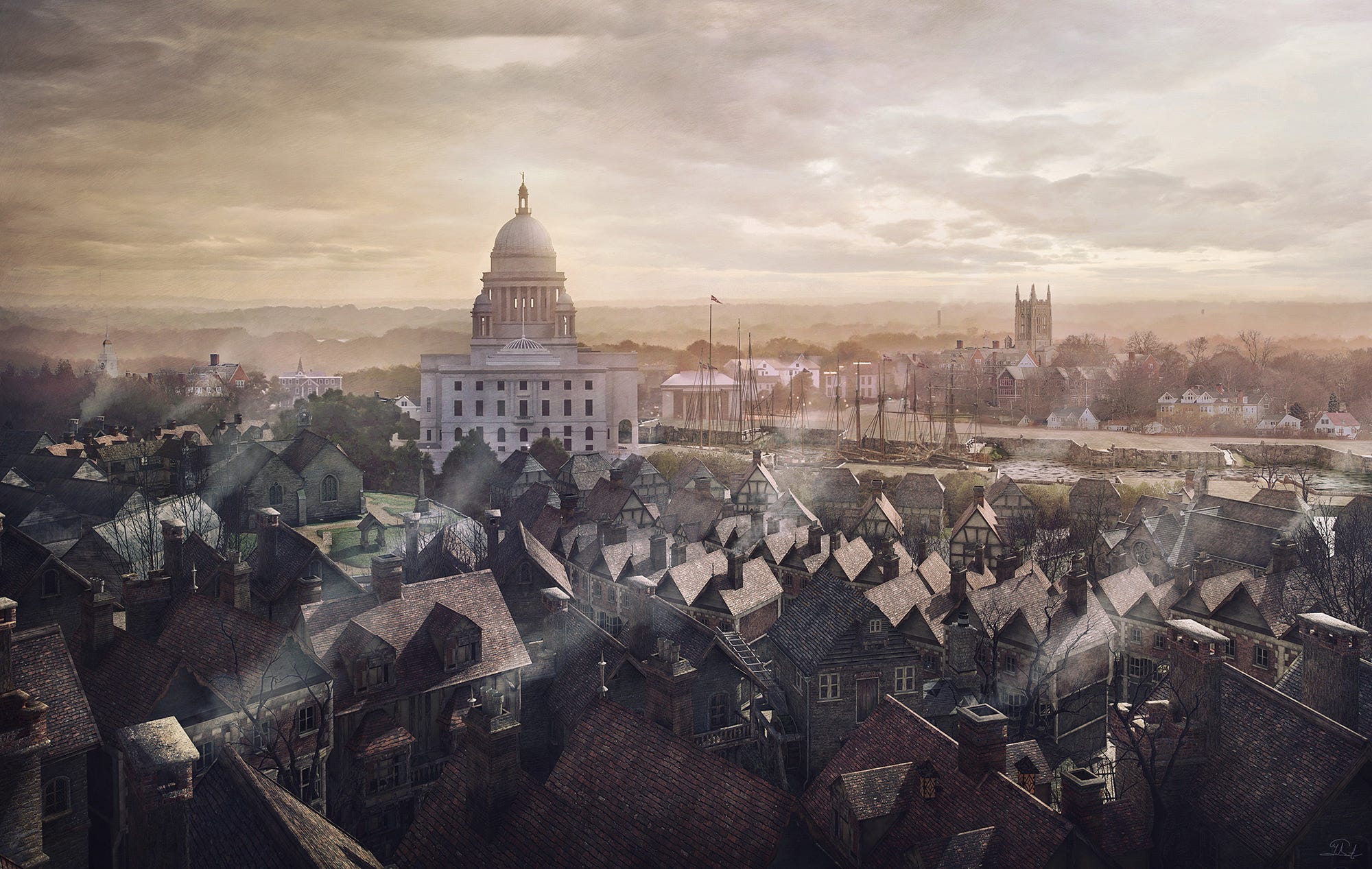 “One of the child’s first memories was of the great westward sea of hazy roofs and domes and steeples and far hills which he saw one winter afternoon from that great railed embankment, all violet and mystic against a fevered, apocalyptic sunset of reds and golds and purples and curious greens. The vast marble dome of the State House stood out in massive silhouette, its crowning statue haloed fantastically by a break in one of the tinted stratus clouds that barred the flaming sky. […] Sometimes, as he grew taller and more adventurous, young Ward would venture down into this maelstrom of tottering houses, broken transoms, tumbling steps, twisted balustrades, swarthy faces, and nameless odours; winding from South Main to South Water, searching out the docks where the bay and sound steamers still touched.” – The Case of Charles Dexter Ward, H. P. Lovecraft