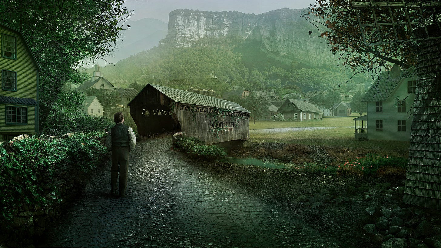 When a traveller in north central Massachusetts takes the wrong fork at the junction of the Aylesbury pike just beyond Dean’s Corners he comes upon a lonely and curious country. The ground gets higher, and the brier-bordered stone walls press closer and closer against the ruts of the dusty, curving road. […] As the hills draw nearer, one heeds their wooded sides more than their stone-crowned tops. Those sides loom up so darkly and precipitously that one wishes they would keep their distance, but there is no road by which to escape them. Across a covered bridge one sees a small village huddled between the stream and the vertical slope of Round Mountain, and wonders at the cluster of rotting gambrel roofs bespeaking an earlier architectural period than that of the neighbouring region. One dreads to trust the tenebrous tunnel of the bridge, yet there is no way to avoid it.” – The Dunwich Horror” by H.P. Lovecraft